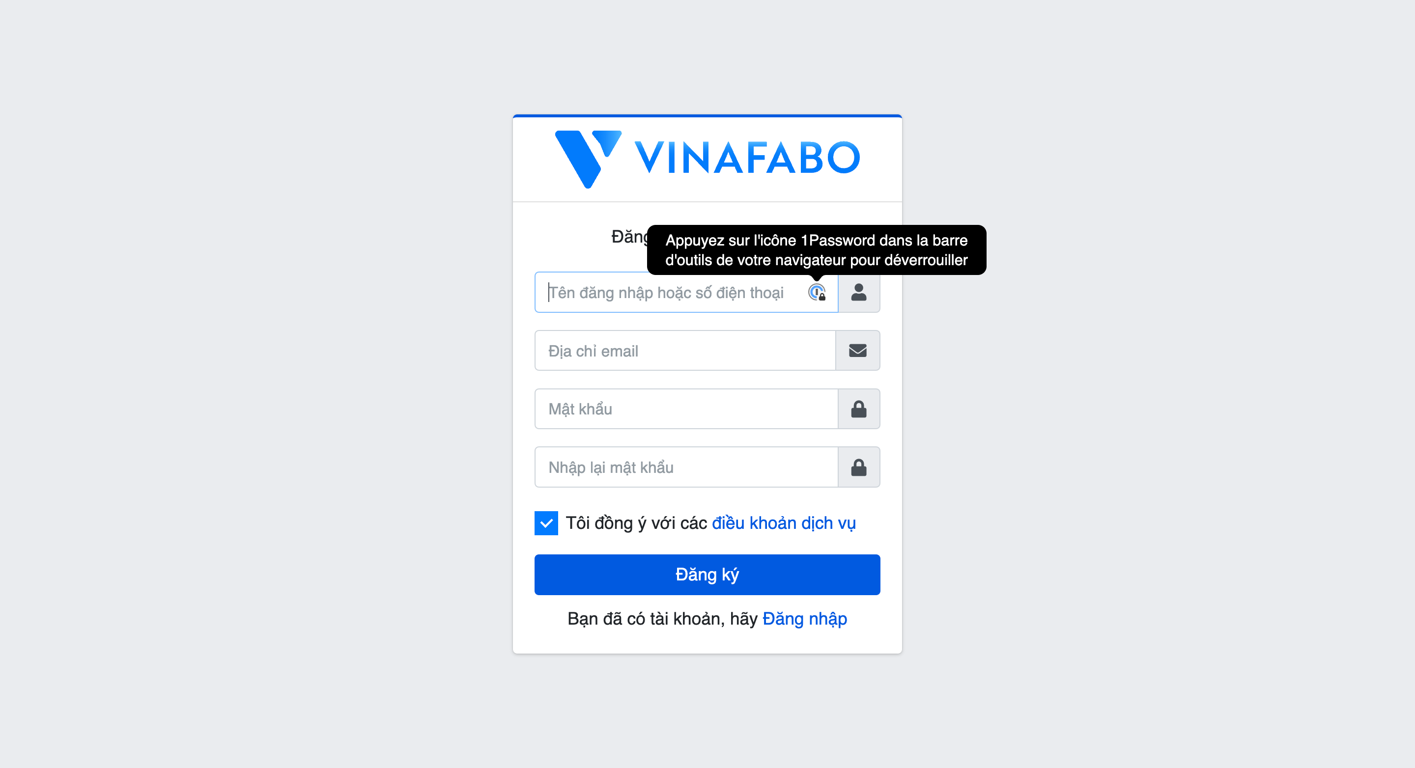 Hãy nhấp vào đường link Vinafabo, sau đó thực hiện thao tác điền thông tin để đăng kí hoặc nếu bạn đã có tài khoản trước đó thì đăng nhập luôn nhé. Các thao tác khá đơn giản nên đừng lo ngại sẽ mất quá nhiều thời gian đâu!